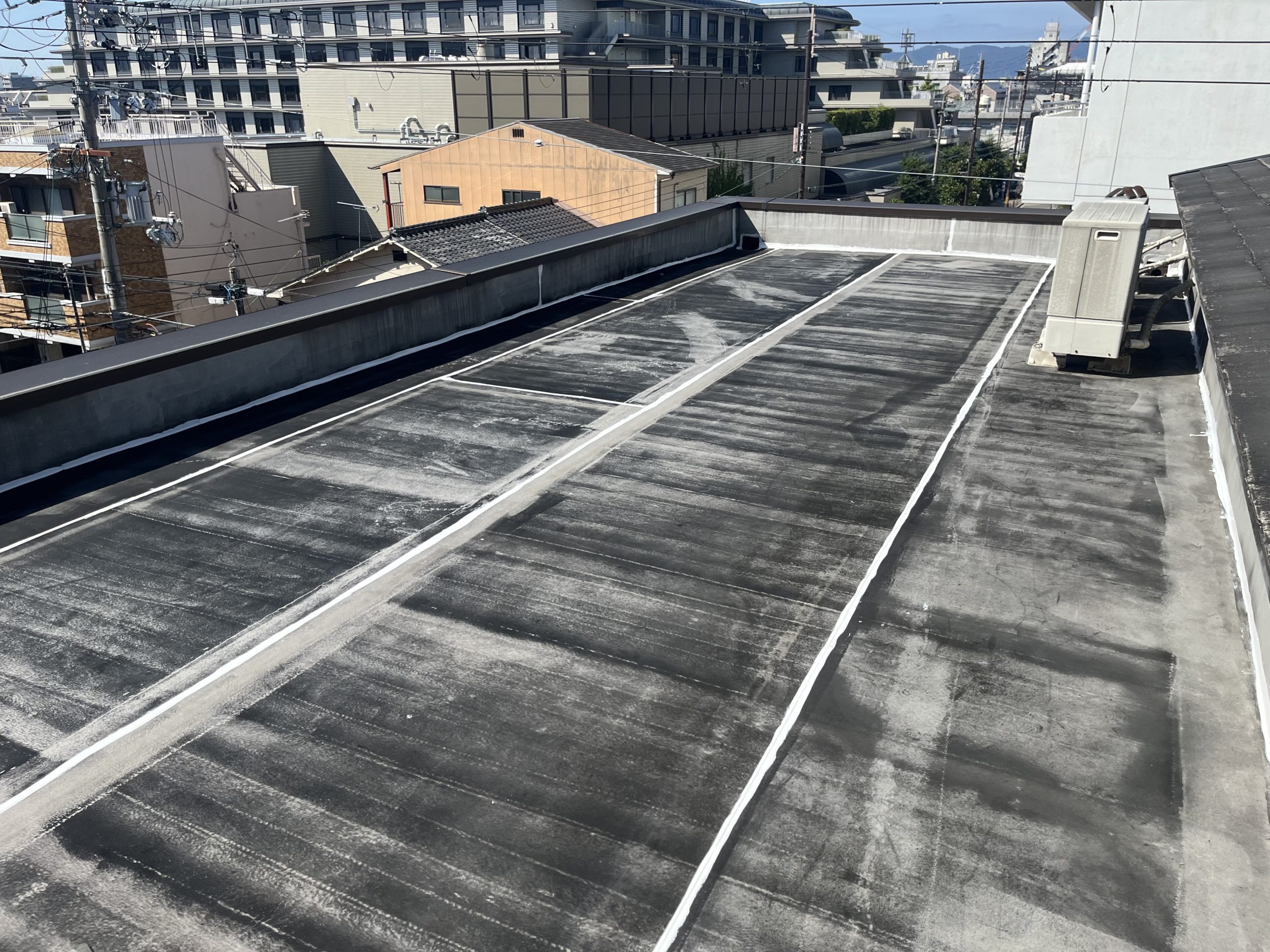 今回は屋上の防水トップコート塗り替えです。現状は雨漏れは発生してないですが表面の保護層が経年劣化により剥がれてしまい大事な防水層が丸見えになっていますこのまま放置していると防水層が破断したり穴が空いて雨漏れが発生します…しかしお客様のナイスタイミングのお見積もり依頼でコストをかけずに防水の耐久寿命を伸ばす処置が出来ました 普段あまり目につかない屋上や屋根は雨漏れしていないからといって放置しすぎず早め早めのメンテナンスを行うことによって低コストにて工事が可能です 雨漏れしてからではいろんな処置が必要になってきますのでコストがかかってしまいますので注意が必要です。 些細なご依頼でも大歓迎ですのでぜひご連絡下さいませ (株)KOTOBUKI